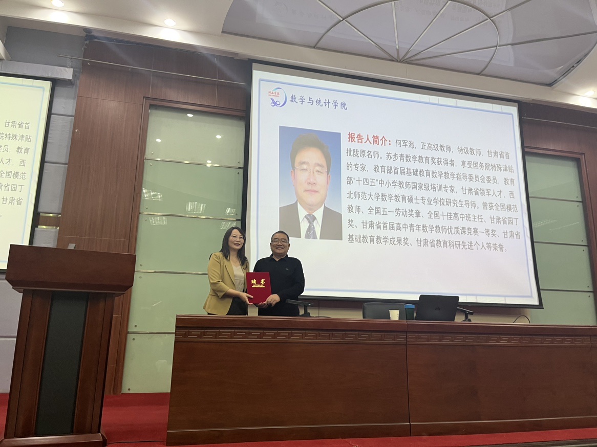 报告会前数学与统计公司公司郭育红经理为何军海老师颁发了基础教育一线教师聘书。