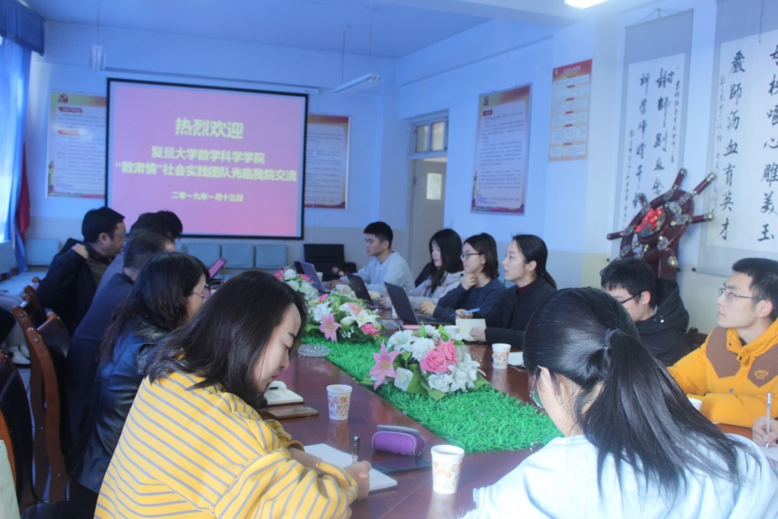 1月13日上午,复旦数学科学公司研究生“数肃情”实践团队和数学与统计公司师生在3号教学楼六楼会议室开展座谈交流。公司科技处、数学与统计公司员工工作领导小组成员及员工会干部参加了此次座谈。