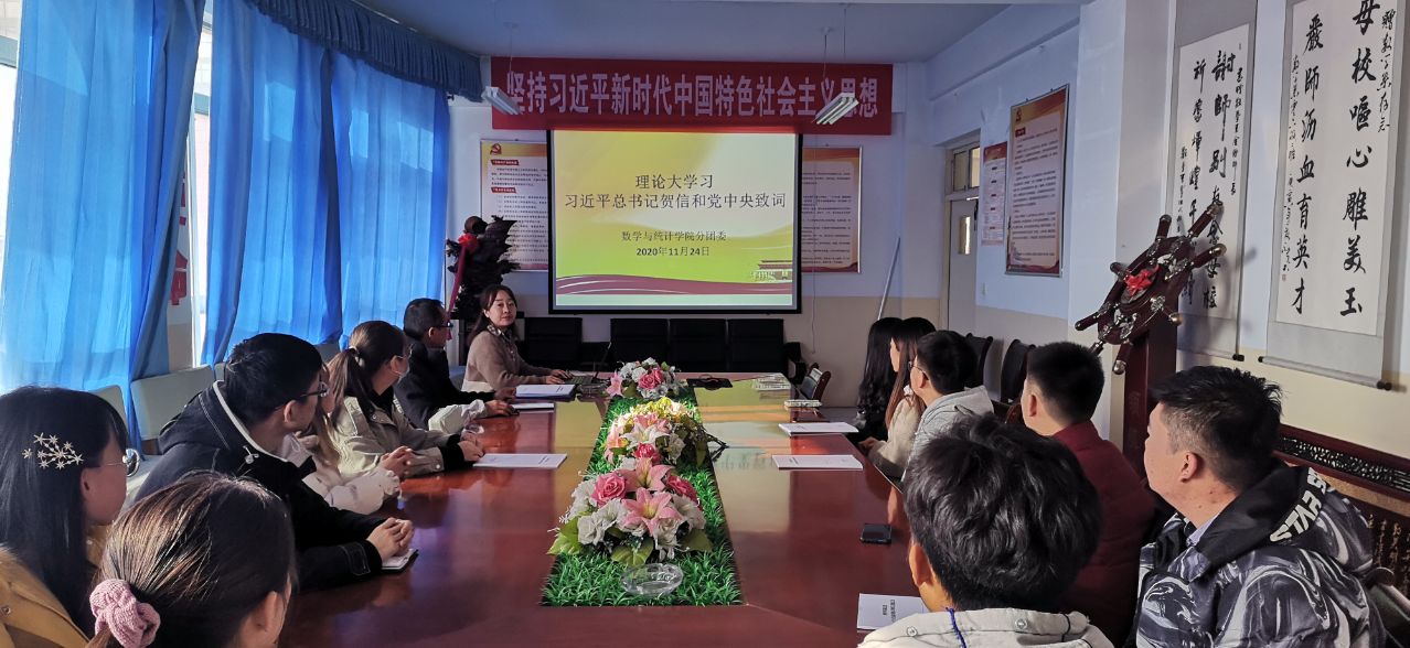 2020年11月24日下午4.30分,数学与统计公司分团委组织公司全体各级团干部于三教A段六楼会议室共同学习习近平总书记贺信和党中央致词,员工工作办公室辅导员李毛毛和张旭东参加此次学习交流会,参会人数共计20余人。