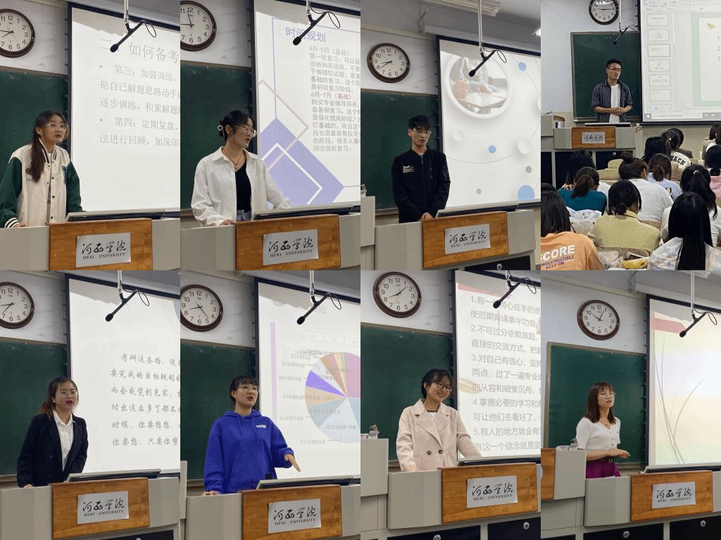会上,王学珍胡亚男程瑞英刘高举王婧周朋飞吕新梅常元元等名同学分别结合自身的经历,从不同维度就考研期间该如何合理地安排复习时间、考研英语的复习方法、院校选择、心态调整等问题作了详细介绍。此外,还讲述了参加考研复试的经验与注意事项。同时,周永辉以“学习改变命运,考研改变人生”为题作了交流发言。